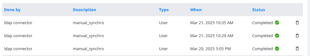 In de kolom Beschrijving geeft manual_synchro een handmatige synchronisatie aan en auto-interval een geplande synchronisatie.