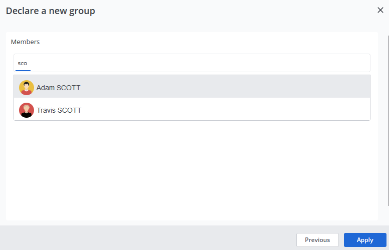 - Om leden toe te voegen, voert u de eerste letters van hun naam of e-mailadres in. Er verschijnt een lijst met overeenkomende vermeldingen zodat u het lid van uw keuze kunt selecteren.