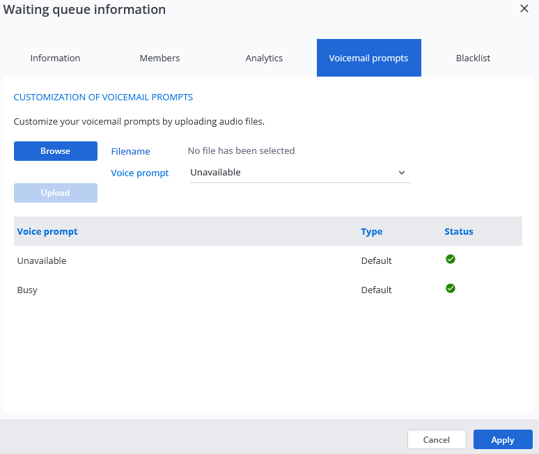 - Als Voicemail is geselecteerd, pas dan de gesproken prompt aan die moet worden afgespeeld wanneer u voicemail opent: zie: Stemprompts voor oproepoverloop op voicemail aanpassen.