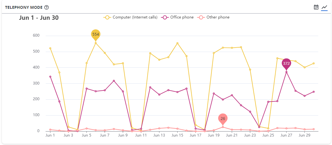 Deze metriek geeft het aantal keren dat de verschillende telefonie-modi in de geselecteerde periode gebruikt zijn (geen oproepen). Het gebruik kan zijn: