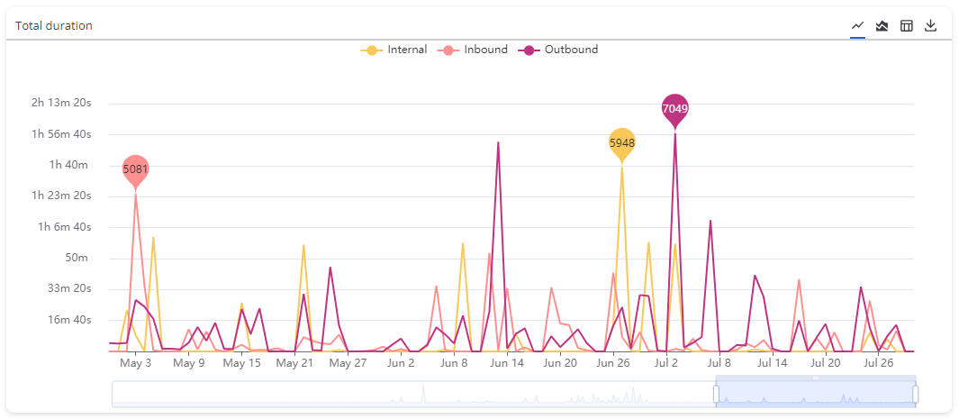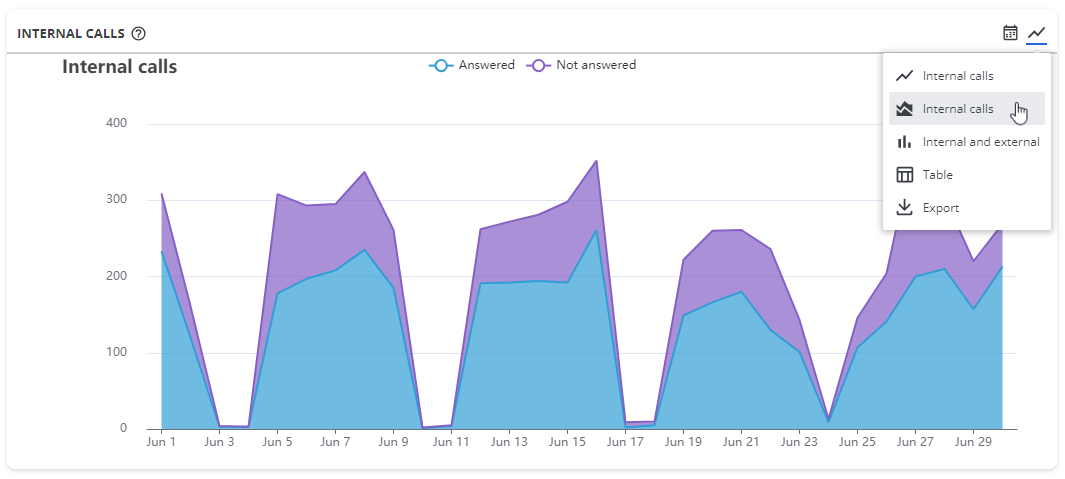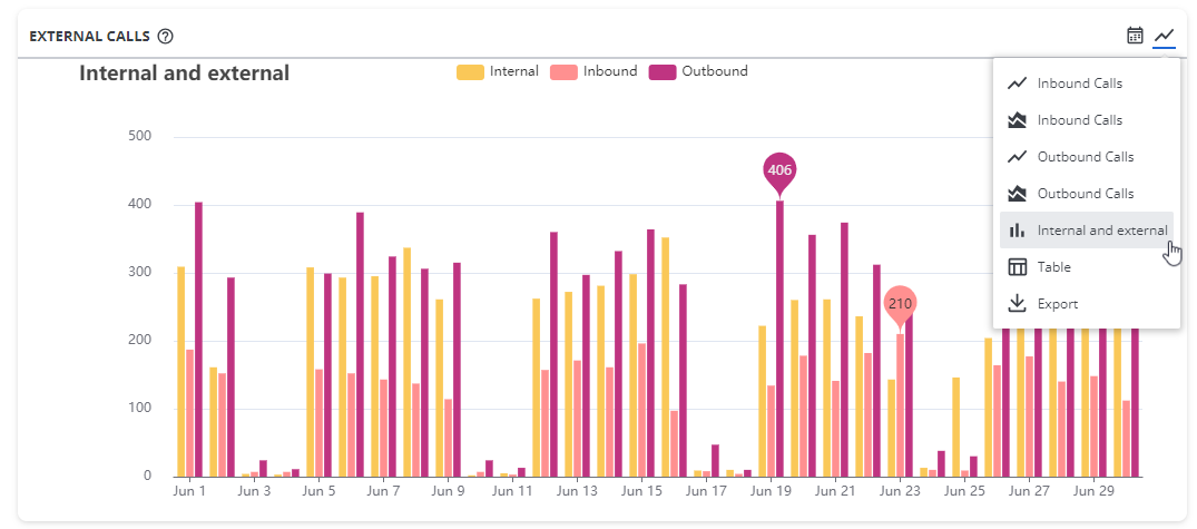 Deze grafiek is het 1-jaar equivalent van de grafiek Interne oproepen en Externe oproepen in het Global dashboard: