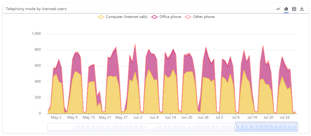 Deze grafiek is het 1-jaar equivalent van het Global dashboard Telefonie. De grafiek is beschikbaar als lijngrafiek of als gestapelde vlakgrafiek: