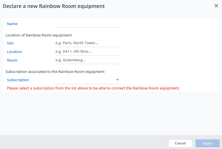 Deze informatie zal bedrijfsleden helpen om de vergaderruimte in Rainbow te zoeken. - Selecteer in het veld Abonnement de ruimtelicentie uit de lijst met licentieaanbiedingen.