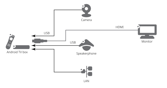 - Vergaderruimten moeten een compatibele Android TV box, een monitor en audio/video-apparaten hebben.
