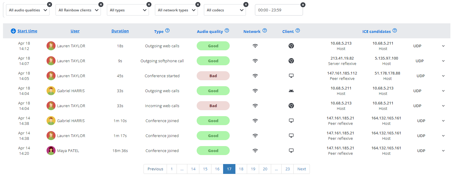 Oproepen die gedaan worden met een fysieke Rainbow Hub telefoon of met een Rainbow client op Firefox worden momenteel niet ondersteund en worden hier weergegeven met 'Onbekende' kwaliteit. Oproepen gedaan met een fysieke OXE of OXO telefoon verschijnen hier niet.