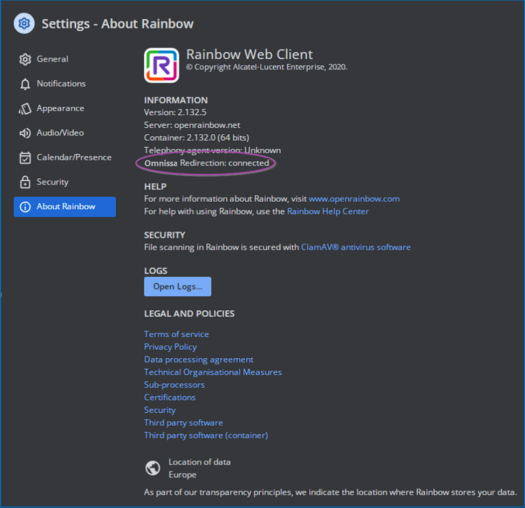 - Voer de Rainbow Desktop-toepassing v2.156.2 of hoger uit, met de Omnissa Horizon WebRTC Redirection SDK standaard geïntegreerd.