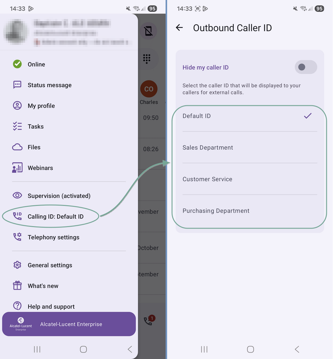 Selecteer Beller-ID in het menu dat u opent via uw profielafbeelding. Dit item geeft ook de momenteel actieve oproep-ID weer. Tik erop om de beschikbare opties te bekijken en te kiezen.