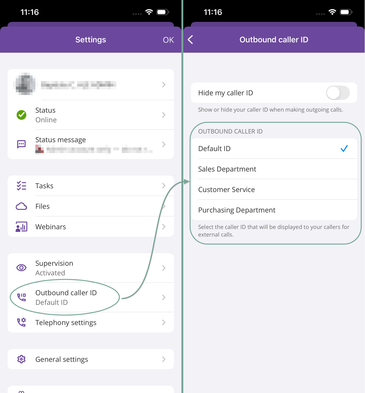 Selecteer Oproep-ID in het menu dat u opent via uw profielafbeelding. Dit item toont ook de momenteel actieve oproep-ID. Tik erop om de beschikbare opties te bekijken en te kiezen.